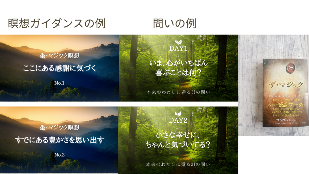 1回目を終えた後、「1人で感謝を習慣とするには、どうするといいのか」、それが課題でした。1日1ページでも、ザ・マジックの本を開いて読むことが、私にとって、感謝を忘れない方法になるのでは、と思いました。