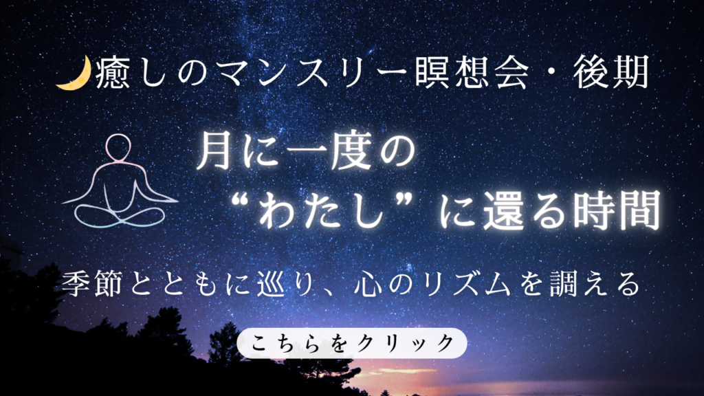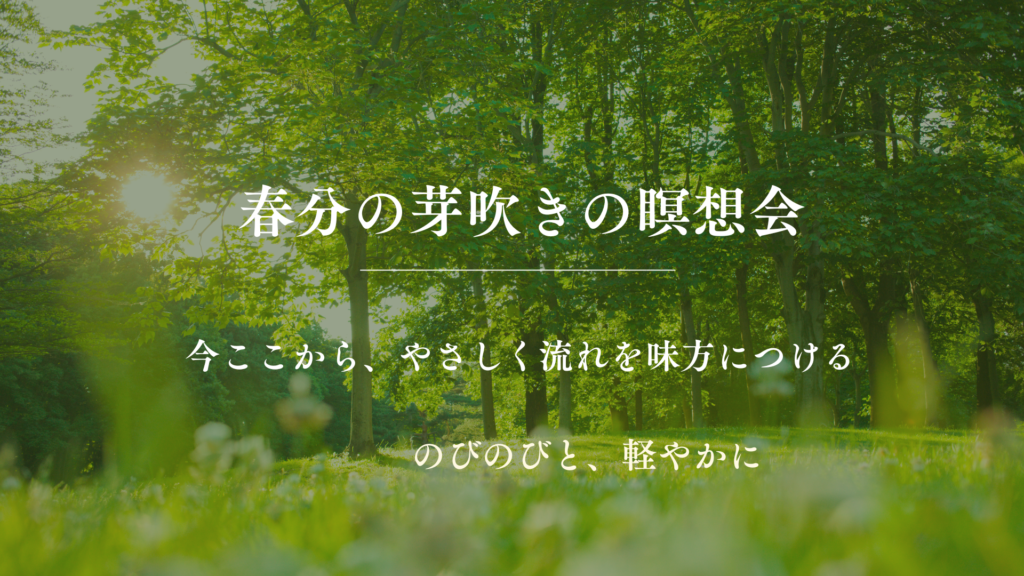 ー瞑想会のご案内ー 《イベント》3/20(春分の日)に開催!春のエネルギーを味方につけよう!<詳細はこちら> 仕事もプライベートも整えたい人へ癒しのマンスリー瞑想会・後期引き続き、毎月第3木曜日の夜にZOOMにて開催!<詳細はこちら> 星の力を味方につける新月・満月の瞑想会星読み×瞑想で宇宙と、自分とつながる時間を<詳細はこちら> ー瞑想レッスンのご案内ー ご不明な点がございましたら、お気軽にお問い合わせください♪ お問い合わせはこちら 《スケジュール一覧に戻る》
