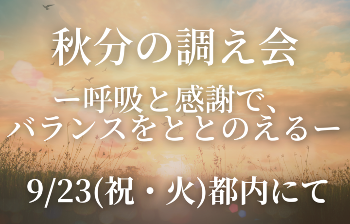 2025.08.01 2025.08.14 9/23(祝)秋分の調え会のご案内 呼吸するだけで調うような都会のオアシスを見つけました! そこで歩く瞑想や、寝転んで体を観察する瞑想などを通して心と体のバランスを調えませんか? <詳細はこちらからどうぞ♪> 記事のタイトルとURLをコピーする 7/11〜坐・マジック・1ヶ月感謝ジャーニーがスタートします! 前の記事 坐・マジック2026まもなくスタート! 次の記事
